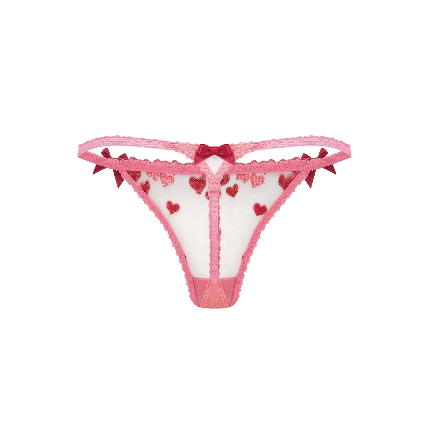 Show your lingerie some love with the Cupid Thong from agent Provocateur. In a seductive sheer tulle construction, this pair is designed to sit just on your hips with a cotton gusset for comfort. With tanga-style thong coverage decorated with a delicate bow to the rear to create a sultry style, this pair is finished with pink and red hearts scattered throughout to add a romantic touch – wear yours with the rest of the Cupid range.