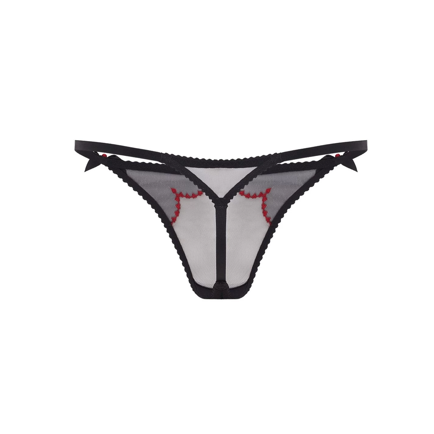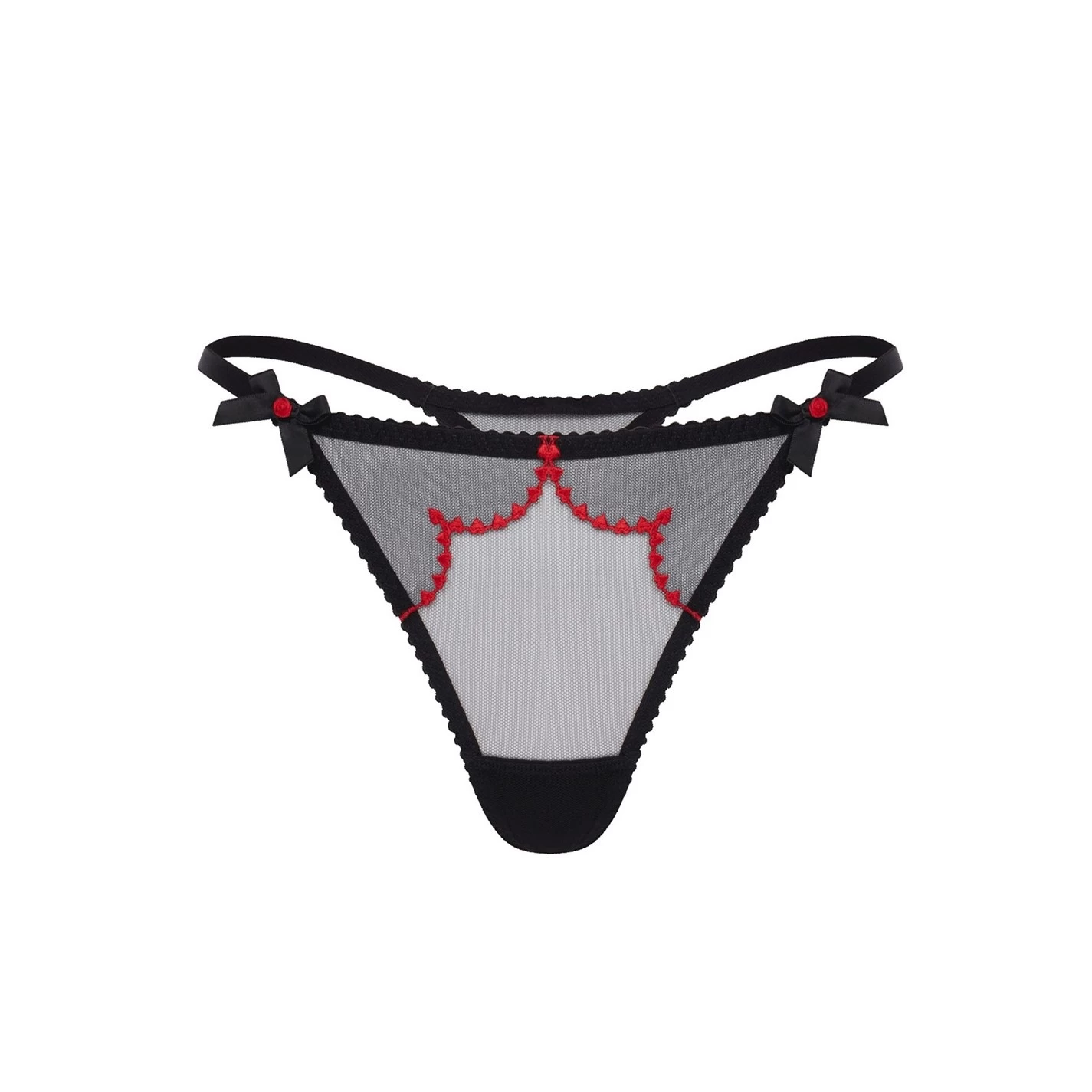 Add to your intimates with the Lorna Heart Thong from agent Provocateur. Characterised by her sheer tulle construction, the Lorna Thong is designed to sit just on the hips with a cotton gusset for comfort. With sultry thong coverage to the rear and delicate bows to the sides, this pair is finished with a scalloped red heart embroidered trim to the front to add an enticingly flirty touch – wear yours with the rest of the Lorna Heart range.