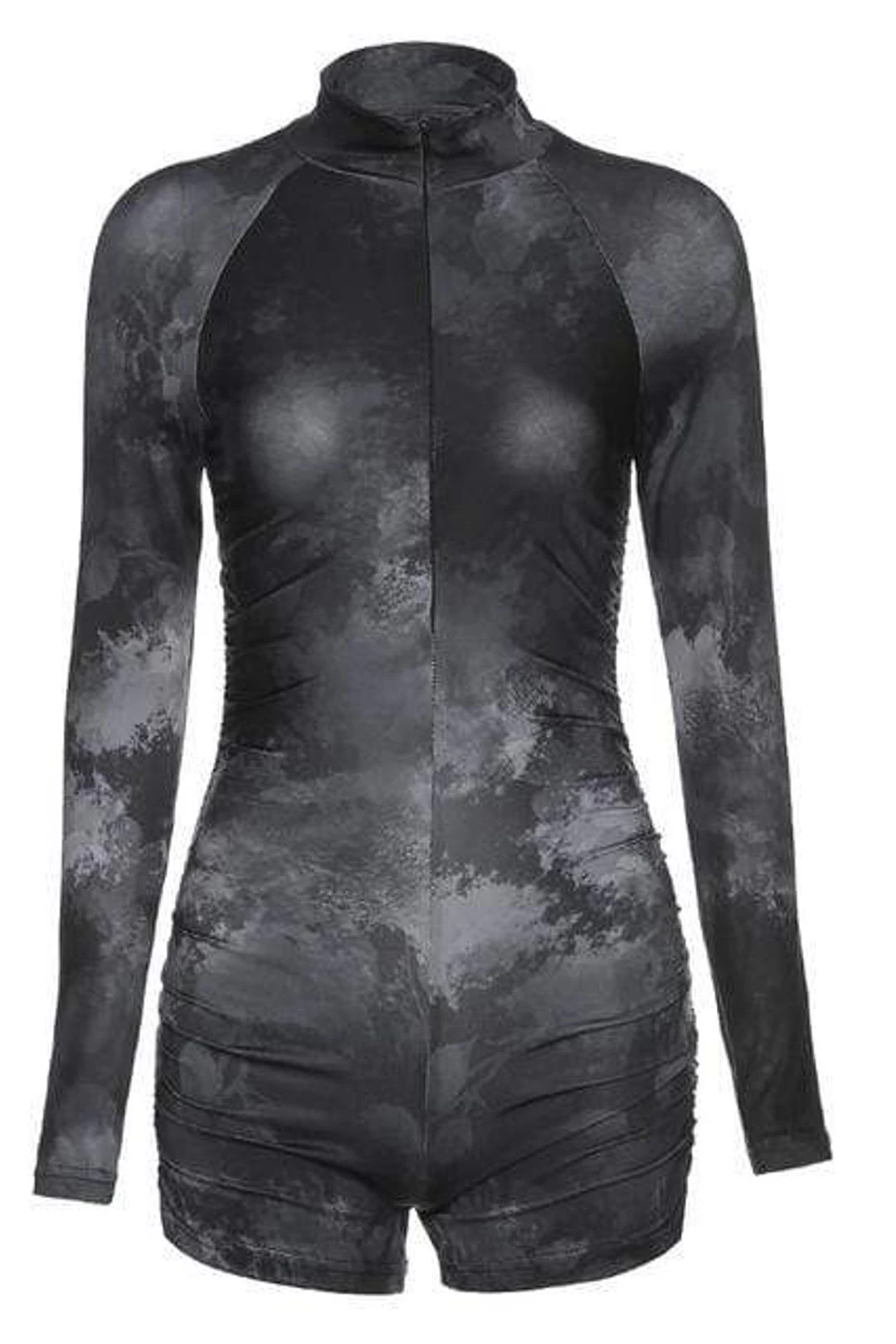 Tie Dye Print Long Sleeve Body Playsuit Women Sexy Zipper Deep V Neck Biker Shorts Bodycon Ruched Sport Rompers Womens Jumpsuit