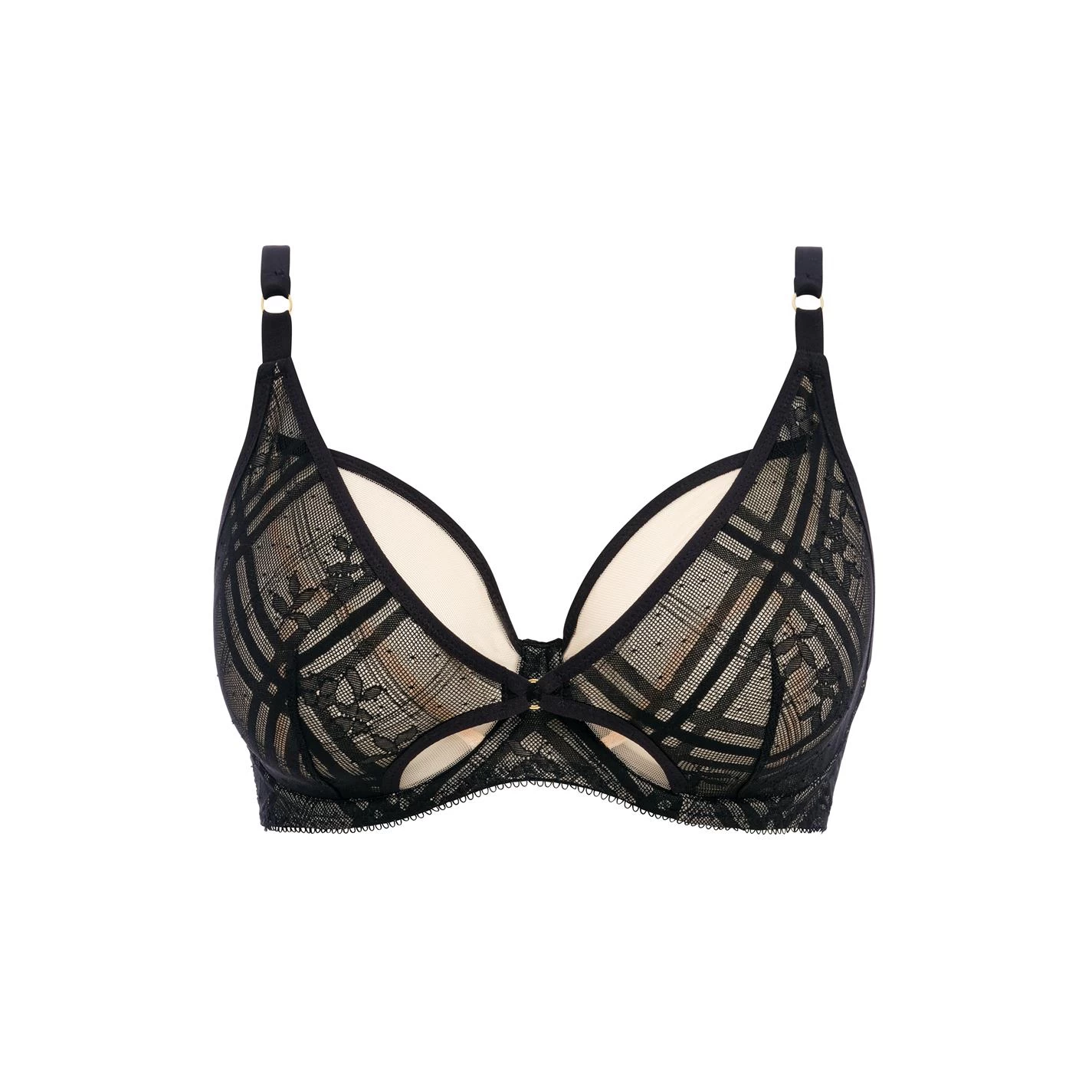 This new underwired High Apex Bra has a plunge neckline frame made from a rigid semi-sheer net for a lighter look without loss of support with a pretty bridge detail in the centre. A stretch Geo Floral lace outer cup creates a high apex and gives forward projection. Featuring with a keyhole cut out detail at centre front this style oozes a stylish new look for Freya. Stylish, but not compromising support, it is fixed with fully adjustable straps to prevent strap slippage and a gold ring detail at centre front and apex.