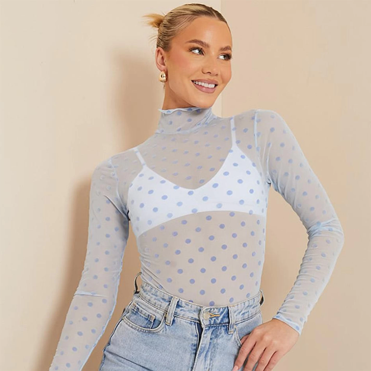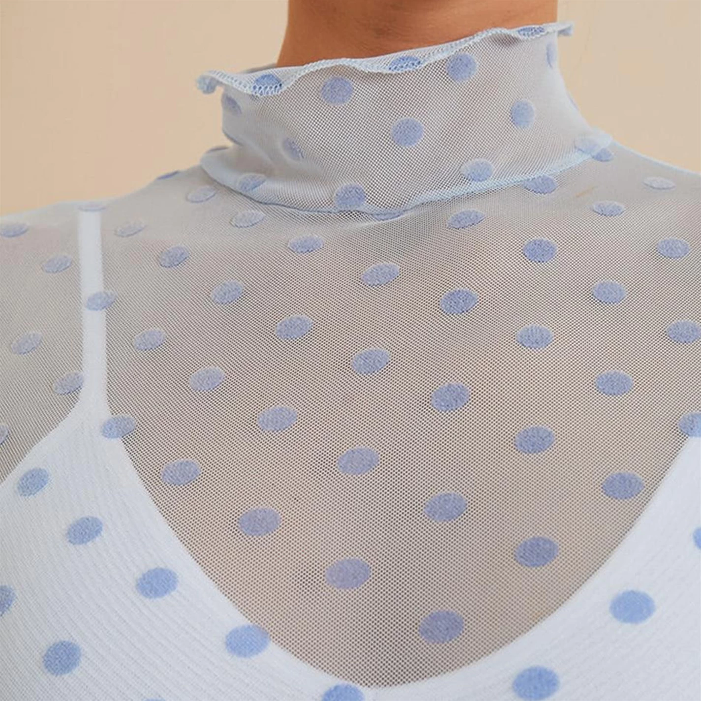 I Saw It First Flocked Mesh Polka Dot Lettuce Hem High Neck Bodysuit