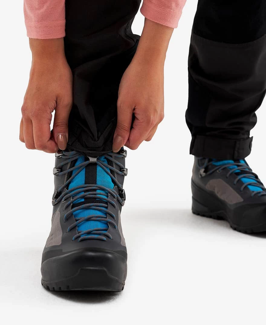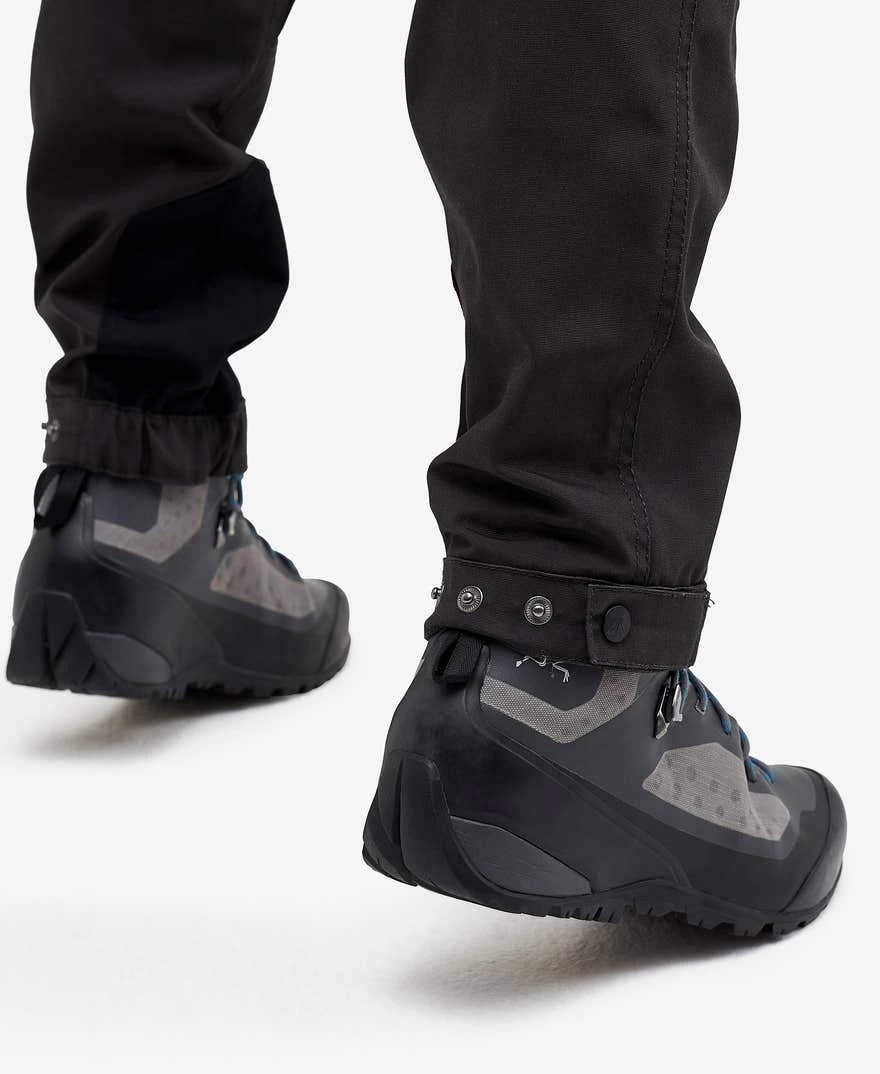 The Nordwand Pro Pants are a pair of multifunctional and stretchy outdoor pants for hiking and other outdoor activities demanding high flexibility. Made from PFC-free Hypershell® material, these pants are both wind- and water-repellent with ventilation zippers at the thighs for added breathability. The 4-way stretch panels over the seat, knees and hips, along with the pre-bent knee design, allow for a greater range of movement and comfort. These pants are built to last, with reinforced areas on the thighs and lower legs to prevent damage from heavy use. They also feature boot hooks at the leg ends, keeping the pants securely in place during any activity. Additionally, the Nordwand Pro Pants have five pockets for convenient storage and adjustable leg endings with buttoned closures for a customizable fit.