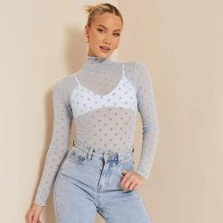 I Saw It First Flocked Mesh Polka Dot Lettuce Hem High Neck Bodysuit
