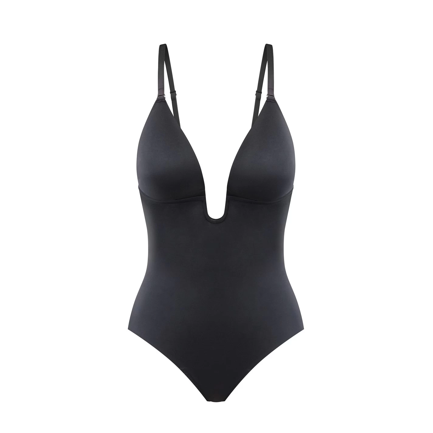 The Suit Your Fancy Plunge Low-Back Thong Bodysuit is the ultimate low-back, low-front solution! Plus, the thong design eliminates visible panty lines and is the perfect solution for shorter hemlines and high-slits. Adjustable and convertible straps offer versatility, while the sleek shaping fabric works its magic “backstage” to ensure your style gets all the applause.