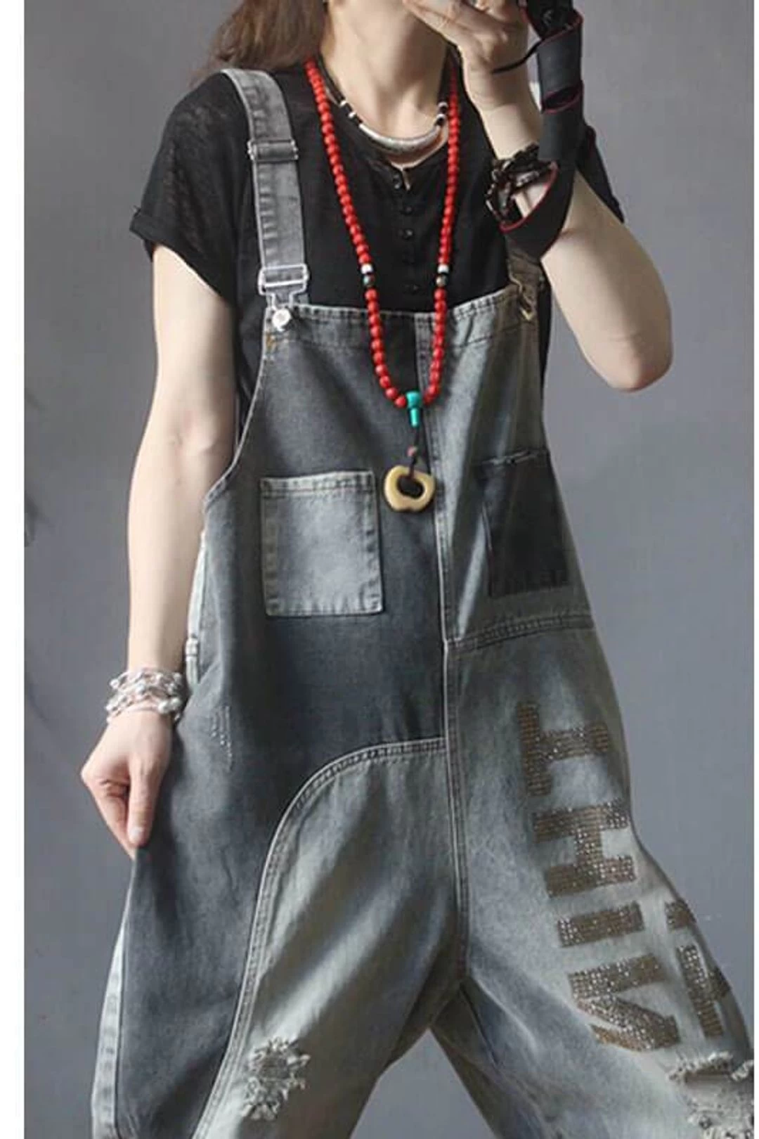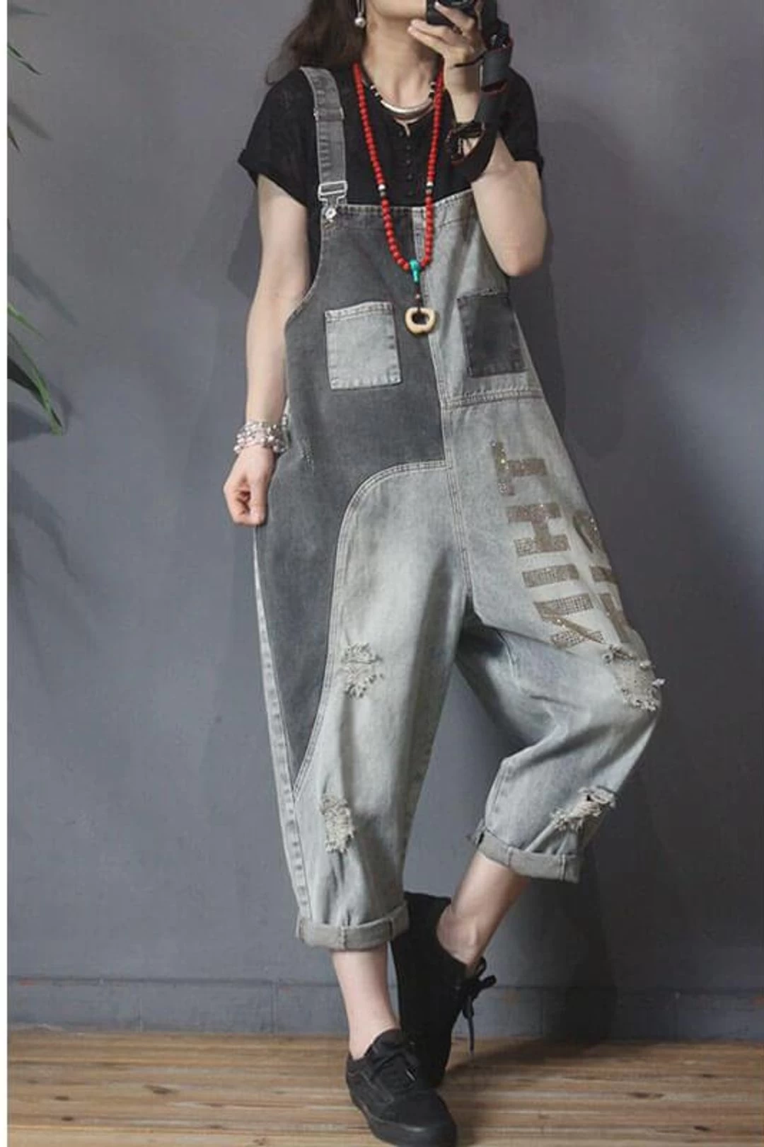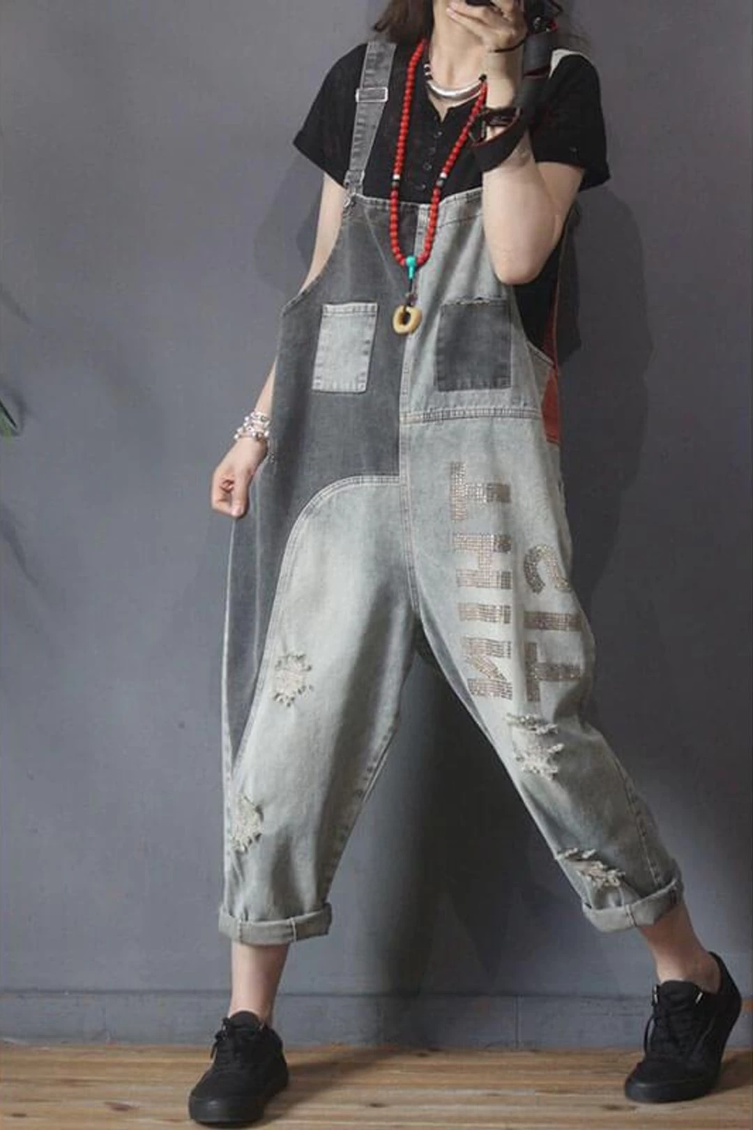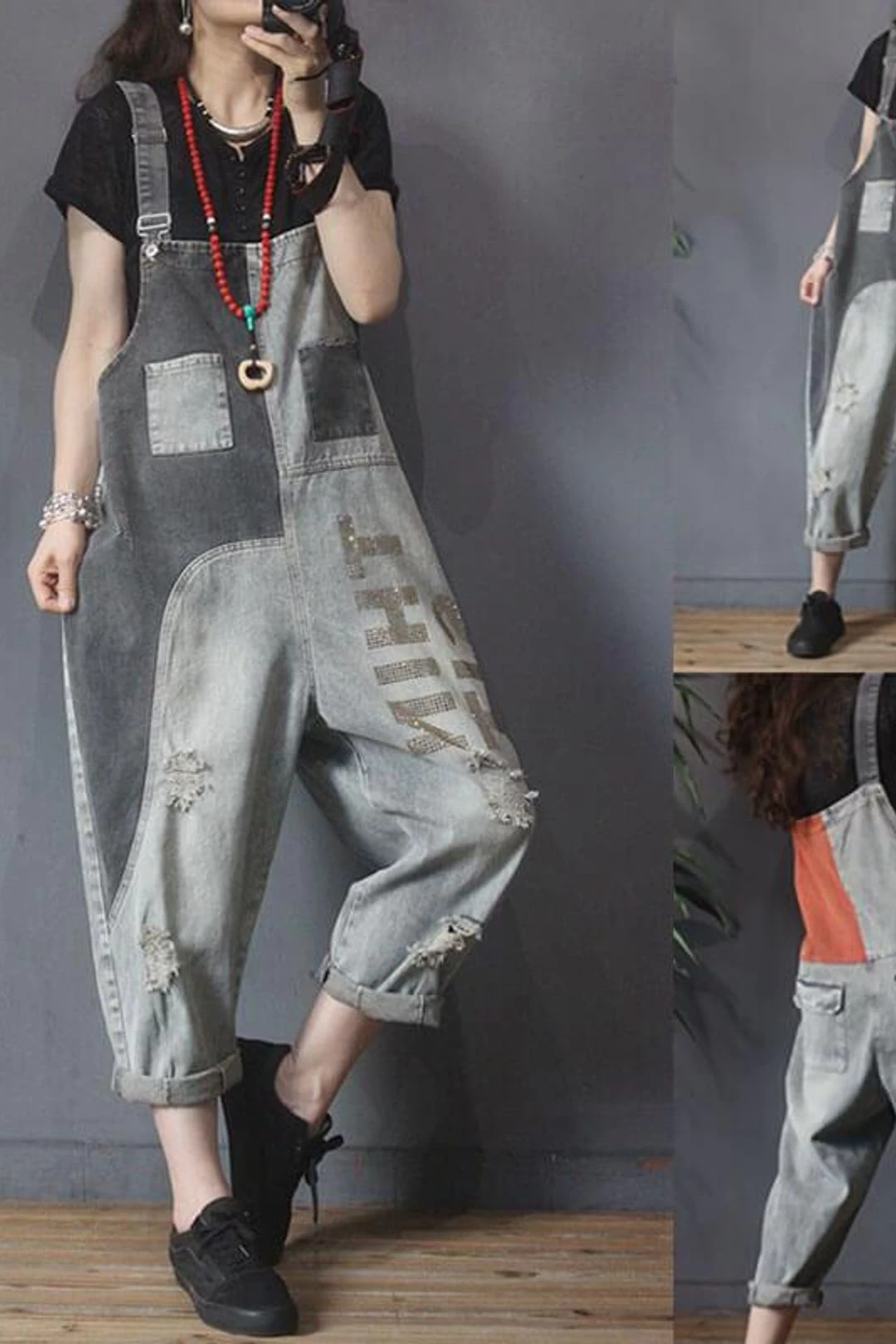 Women Denim Hole Color Spliced Letter Jumpsuits Dungarees