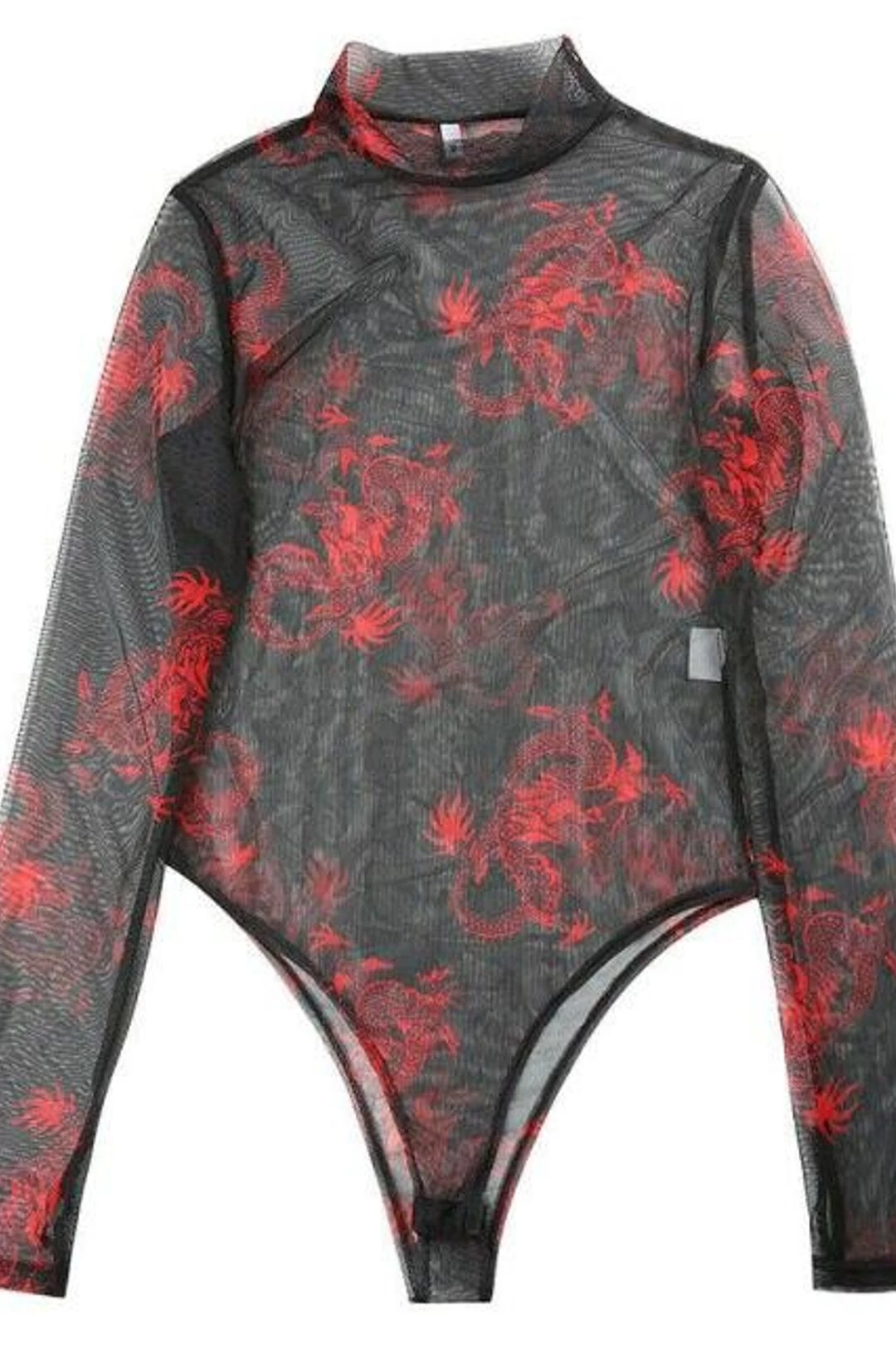 Women Sexy Black Crop Jumpsuits Red Green Chinese Vintage Dragon Print Mock Neck Long Sleeve Hollow Mesh See Through Bodysuits